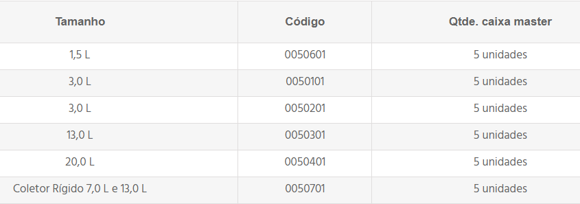 . Disponíveis para todos os tamanhos 7,0 e 13,0 L para os modelos de coletores rígidos;